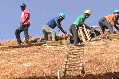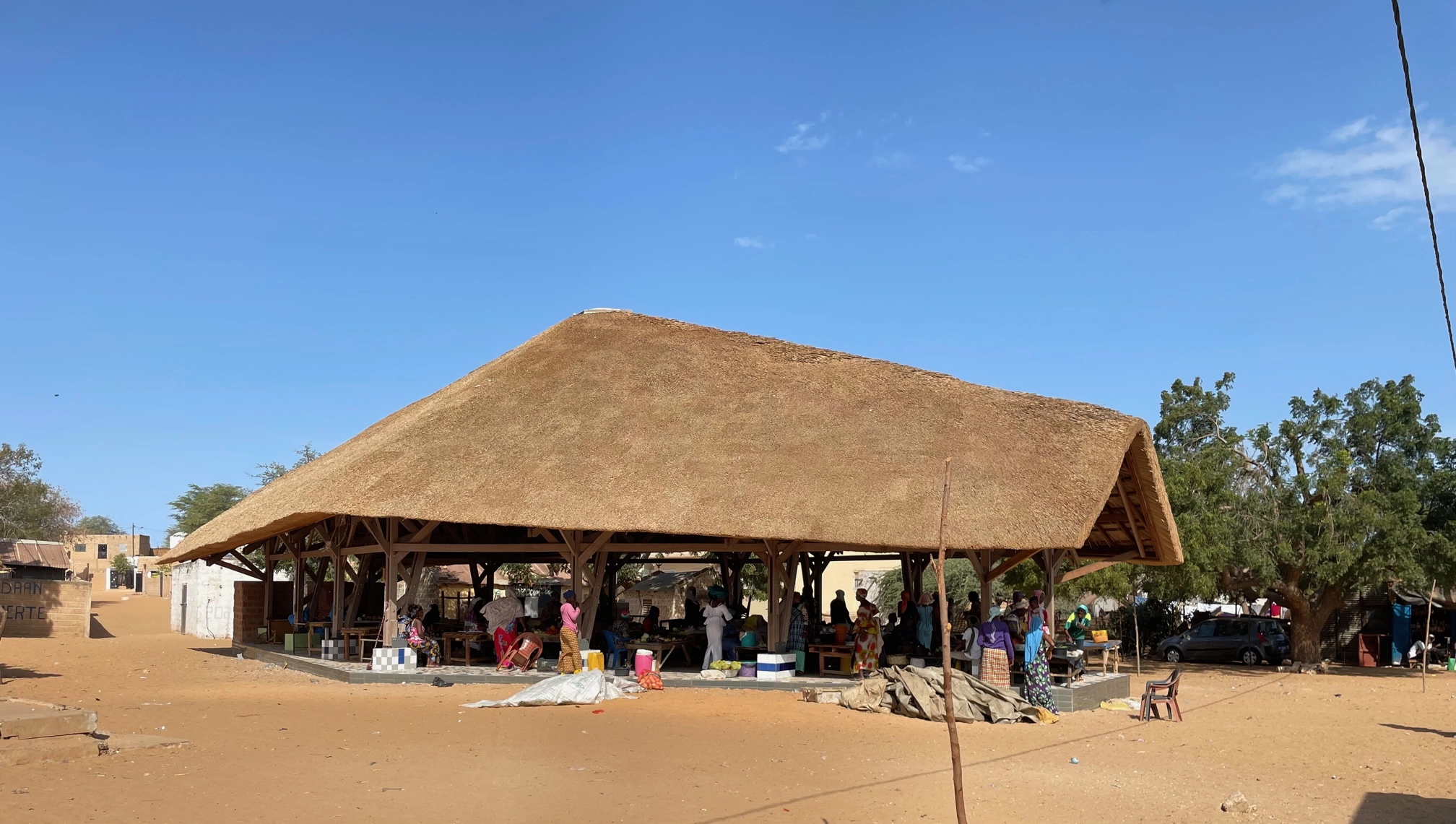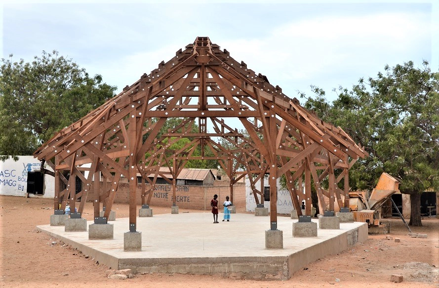 Charpente en bois KOSIPO et couverture en chaume de 40 cm d’épaisseur constitué de Typhas, plante invasive du fleuve Sénégal. Locaux techniques en briques de terre crue, carrelage en OPUS INCERTUM.